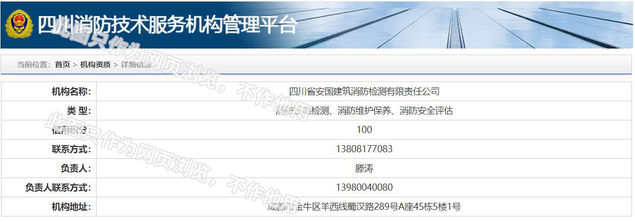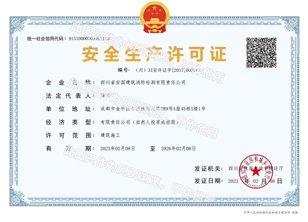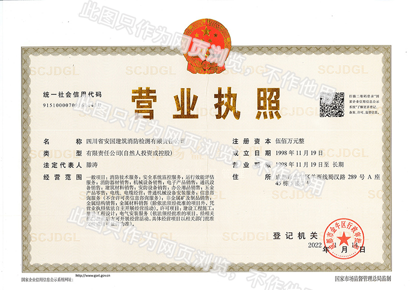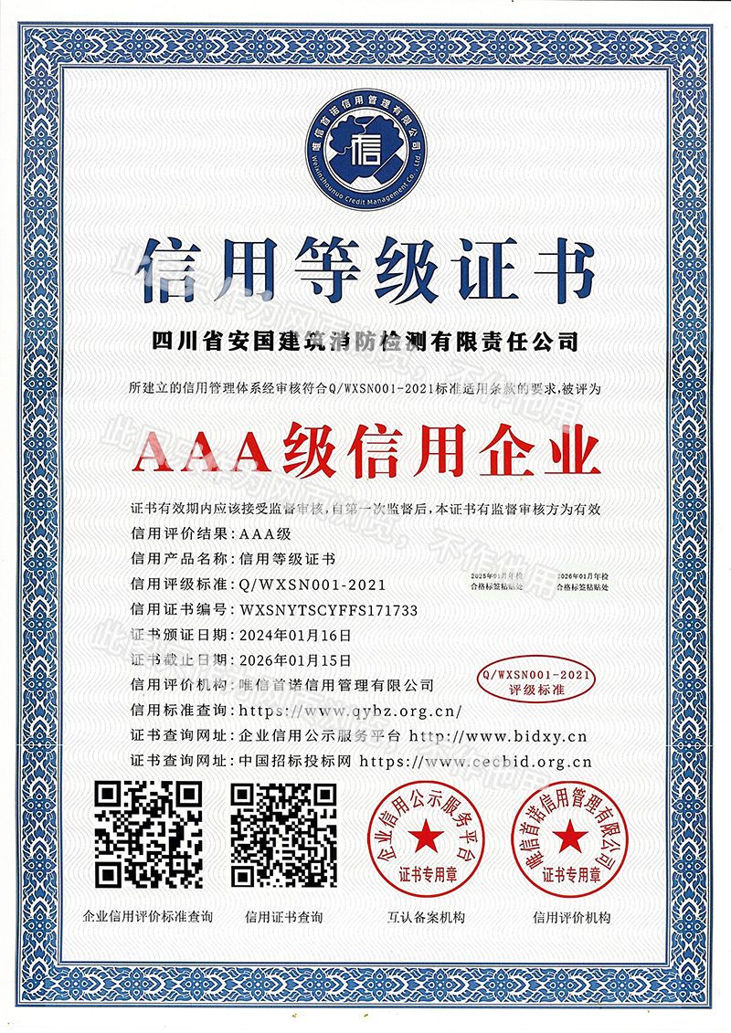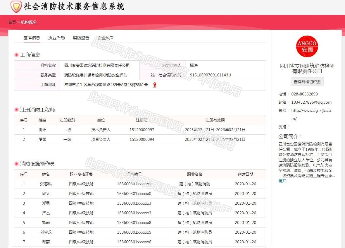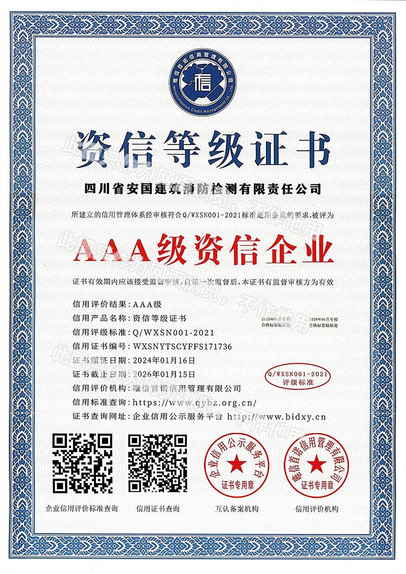 四川省安國建筑消防檢測有限責(zé)任公司,成立于1998年,經(jīng)四川省公安消防總隊批準(zhǔn),工商部門注冊的獨(dú)立法人單位。 公司具有建筑消防設(shè)施檢測、電氣防火安全檢測、維修、保養(yǎng)及技術(shù)咨詢一級資質(zhì)的中介技術(shù)服務(wù)機(jī)構(gòu),獲得CMA計量認(rèn)證。主要業(yè)務(wù)范圍是:接受建設(shè)單位或有關(guān)單位委托,承擔(dān)新建、改建、擴(kuò)建建筑自動消防設(shè)施技術(shù)檢測、電氣防火安全檢測、以及承接建筑消防設(shè)施維護(hù)保養(yǎng),對已交付使用的建設(shè)消防設(shè)施的運(yùn)行情況進(jìn)行運(yùn)行檢測,開展建筑消防設(shè)施的消防安全技術(shù)咨詢。公司設(shè)辦公室、總工辦、財務(wù)部、檢測部、維保部等職能機(jī)構(gòu),擁有一